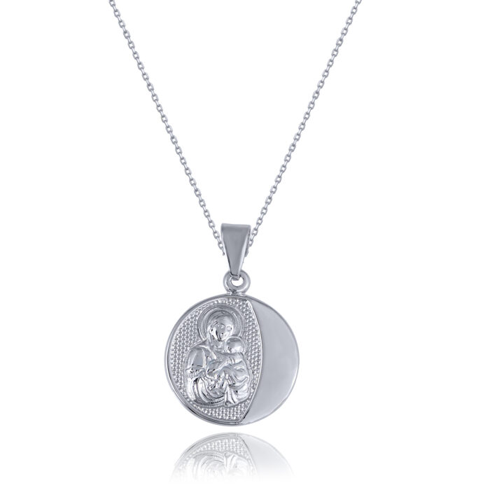 A modern approach of the Amulet of Virgin Mary and Jesus with a textured surface finish made of 14K yellow gold or white gold or 9K yellow gold. This piece of jewelry will accompany you for a lifetime. It is the perfect gift for a newborn baby or to offer to someone special. Together with the Amulet of Virgin Mary and Jesus we offer you a 925° sterling silver 24 karat gold plated pin or a 925° sterling silver pin.